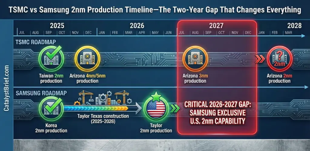 Taiwan’s National Science and Technology Council reaffirmed its N-2 export rule in December 2025, restricting TSMC from deploying its most advanced 2-nanometer chip technology at overseas facilities for at least two years. This means TSMC’s Arizona plant will not produce 2nm chips until at least 2027, while Samsung’s Taylor, Texas fab targets 2026 production.