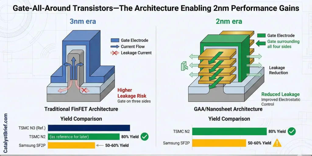 The technical specifications of Samsung’s 2nm process have been a point of debate within the semiconductor industry. Both TSMC and Samsung are transitioning to Gate-All-Around transistor architecture, a fundamental redesign that wraps the gate around all four sides of the channel to minimize current leakage. Samsung was actually the first to implement GAA technology at the 3nm node, though that early introduction was plagued by yield issues that damaged customer confidence. The company claims its second-generation SF2P process has achieved yields around 50-60%, a significant improvement from the low yields that characterized its 3nm ramp but still trailing TSMC’s reported 80% yields for N2
