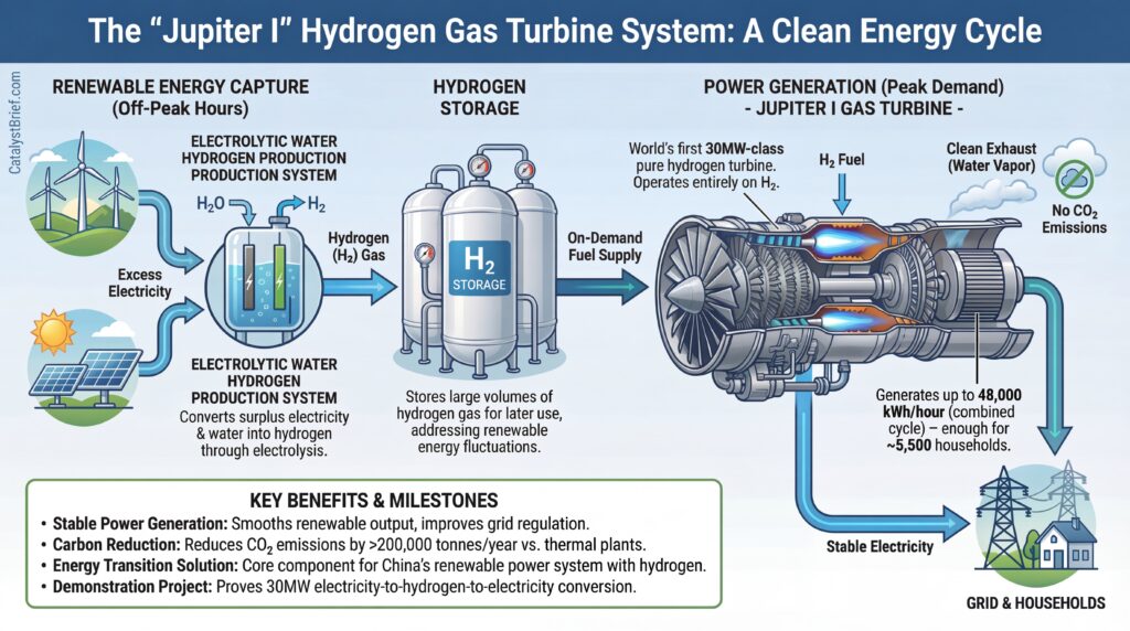 China’s Jupiter I gas turbine began stable power generation on December 22, 2024, in Inner Mongolia, marking the first commercial deployment of a 30-megawatt-class pure hydrogen turbine. Developed by Mingyang Group, the system converts surplus wind and solar electricity into hydrogen through electrolysis, then reconverts it to power during peak demand, enabling long-term energy storage with zero carbon […]