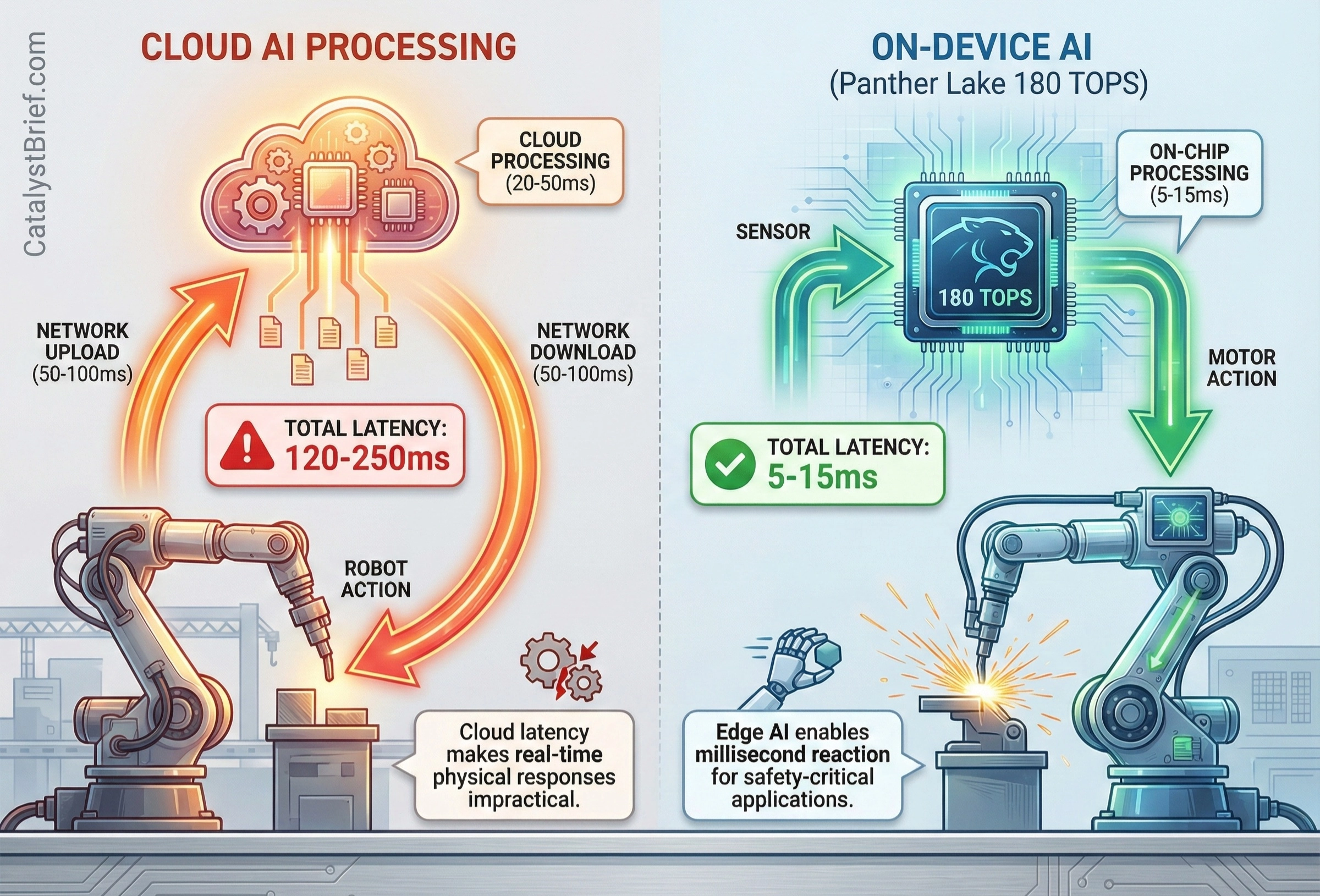 Why does this matter for robotics? On-device AI processing eliminates cloud dependency for split-second decisions. A factory robot adjusting to production schedule changes or an autonomous vehicle detecting cyclists requires latency measured in milliseconds, not the hundreds of milliseconds introduced by cloud round-trips. Intel specifically highlighted robotics applications for Panther Lake, unveiling a new Intel Robotics AI software suite designed to enable cost-effective robot development.