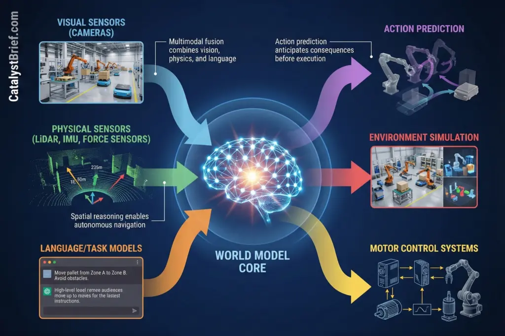 Consider the distinction. A language model can describe how to navigate a factory floor. A world model enables a robot to actually navigate that floor, understanding that certain areas are off-limits during production shifts, that forklifts have right-of-way in specific corridors, and that the loading dock requires different navigation strategies when wet versus dry.