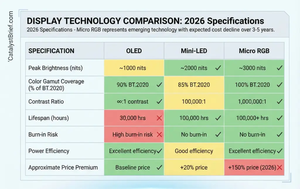 The technical achievement matters less than the competitive dynamics it reveals. Samsung and LG, longtime OLED rivals, are simultaneously pivoting to Micro RGB with 100% color gamut coverage across BT.2020, DCI-P3, and Adobe RGB standards. This coordinated shift suggests OLED’s limitations – particularly burn-in concerns and brightness constraints – are driving premium manufacturers toward alternatives.